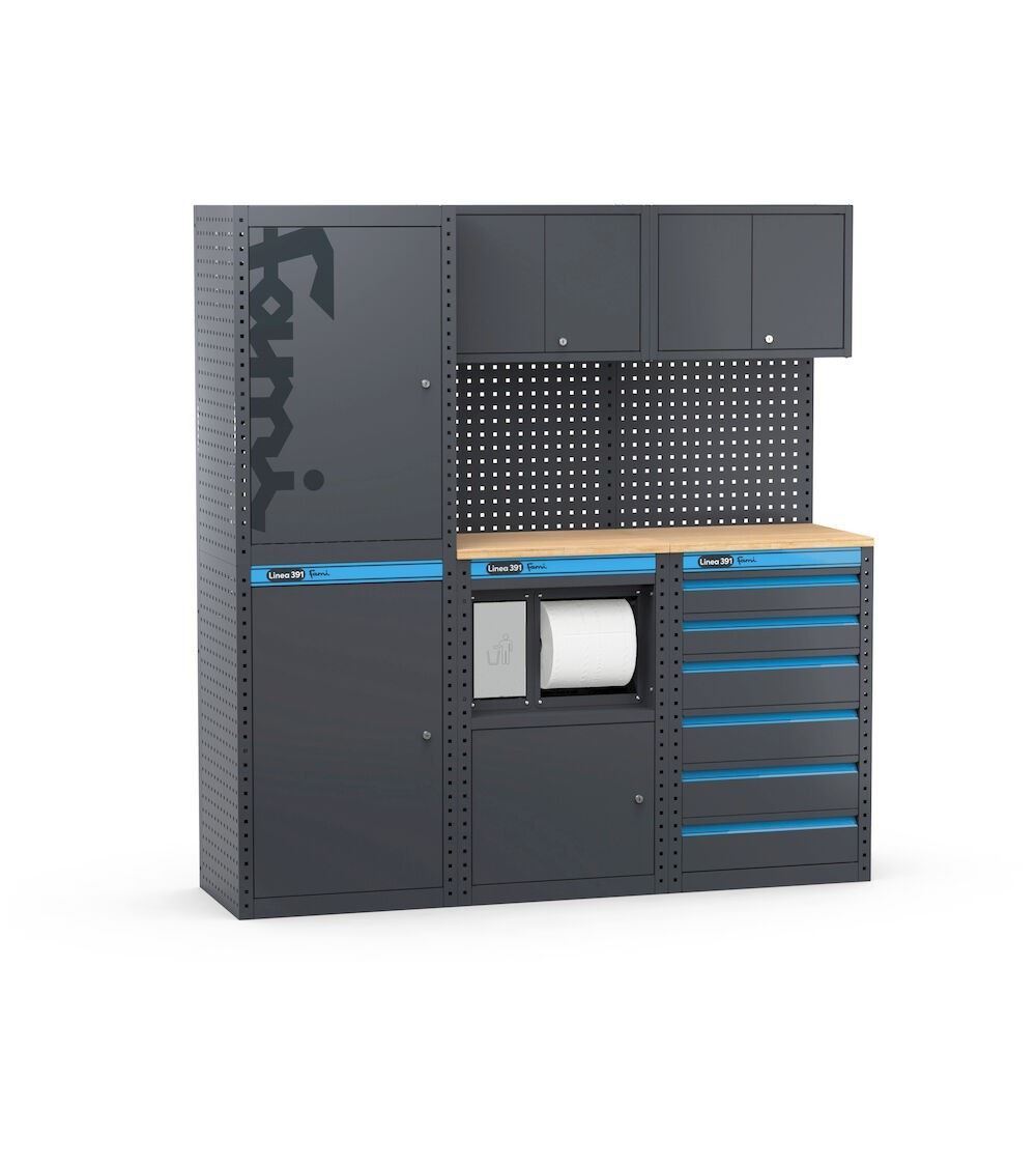 ’arredamento per officina Garage 391 è ideale per chi cerca un sistema modulare, trasformabile e adattabile alle proprie esigenze operative. Grazie alla sua struttura componibile, infatti, i diversi moduli possono essere riposizionati in qualsiasi momento, offrendo flessibilità e praticità senza compromessi. Nella parte inferiore presenta un armadio con un'anta e ripiano regolabile interno, un armadio di servizio dotato di cestino e rotolo con carta e una cassettiera con 6 cassetti ad estrazione telescopica suddivisibili internamente. Completano la composizione un robusto piano di lavoro in multiplex, un ulteriore armadio con anta, 2 pareti porta attrezzi con foro quadro, perfette per il fissaggio di accessori, e 2 pensili con anta, che offrono un ulteriore spazio contenitivo.