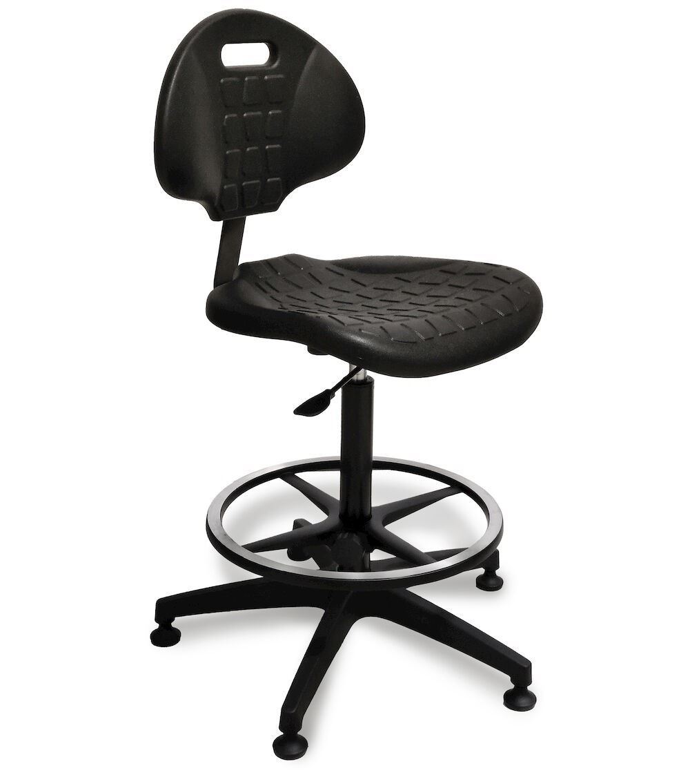 La sedia poggiapiedi girevole in poliuretano è dotata di 5 piedini e consente all'operatore di lavorare in posizione ergonomica grazie alla possibilità di regolare la seduta in altezza e lo schienale in altezza e profondità. Questa sedia da lavoro è la soluzione perfetta per tutti coloro che effettuano operazioni e lavorazioni seduti (laboratori, postazioni di assemblaggio, officine, aule).